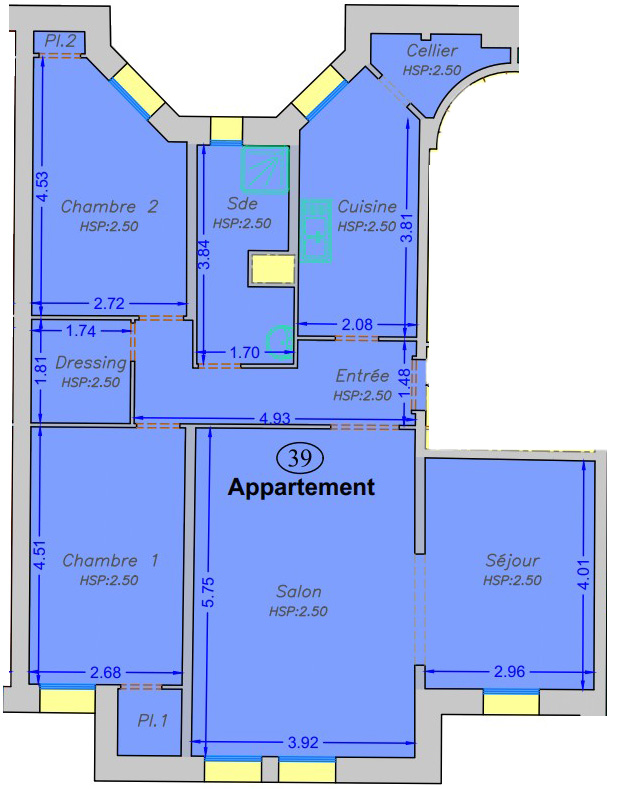Ce logement se compose d'une entrée de 6,70 m², d'un salon de 22,30 m², d'un séjour 12,00 m², de deux chambres de 12,20 m² et 10,70 m², d'une cuisine de 8,80 m², d'une salle de bains (PMR) et d'un WC. Appartement avec placards, dressing et cellier. Chauffage urbain.