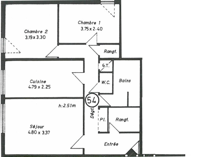 Appartement comprenant entrée, séjour, cuisine fermée, 2 chambres, salle de bains et WC séparés.