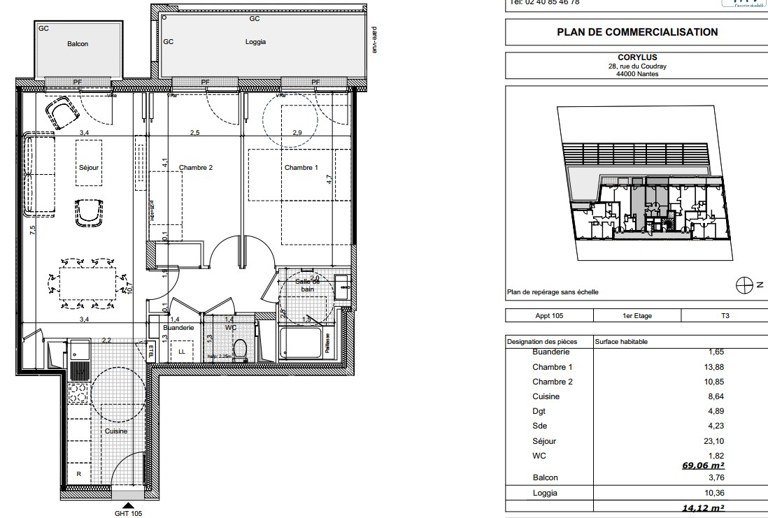 Proche du boulevard des Belges, situé rue du Coudray dans une résidence neuve, bel appartement de type 3, situé au 1 étage d'une surface de 69.06 m2.