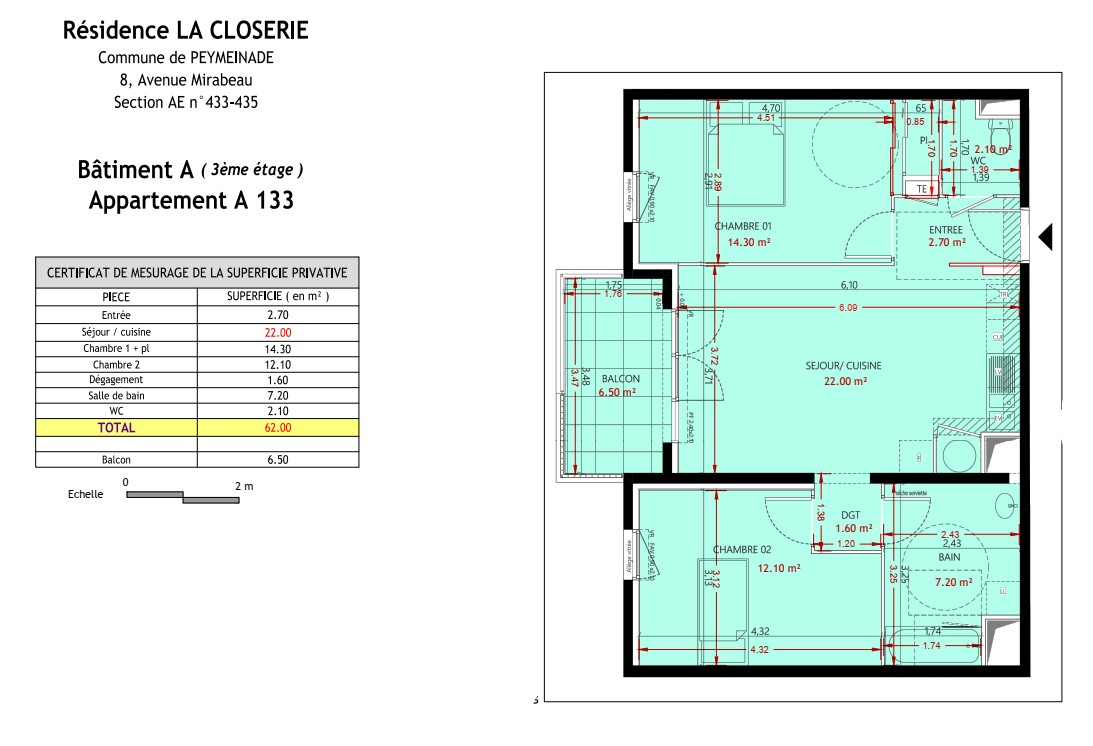 L'appartement est composé d'une entrée, d'un séjour avec cuisine ouverte, 2 chambres, une salle de bains et un WC séparé.
