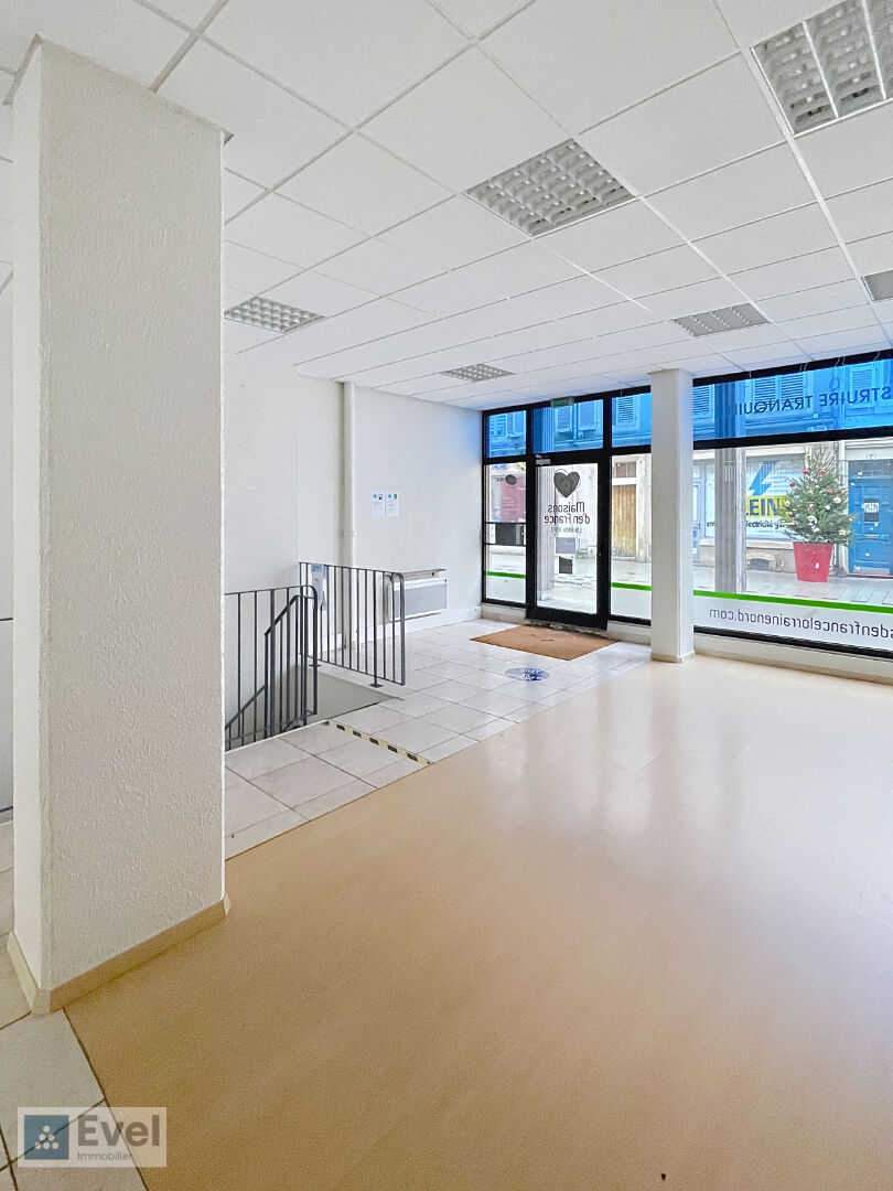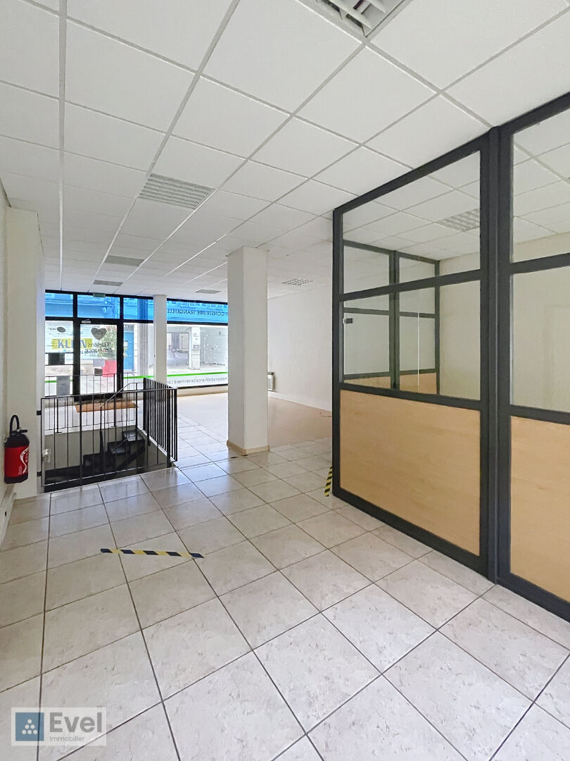 Local commercial au RDC, de 132.66m², comprenant une pièce principale, un bureau vitré, un bureau cloisonné, deux espaces de stockage en sous-sol, et un wc avec lave-mains.