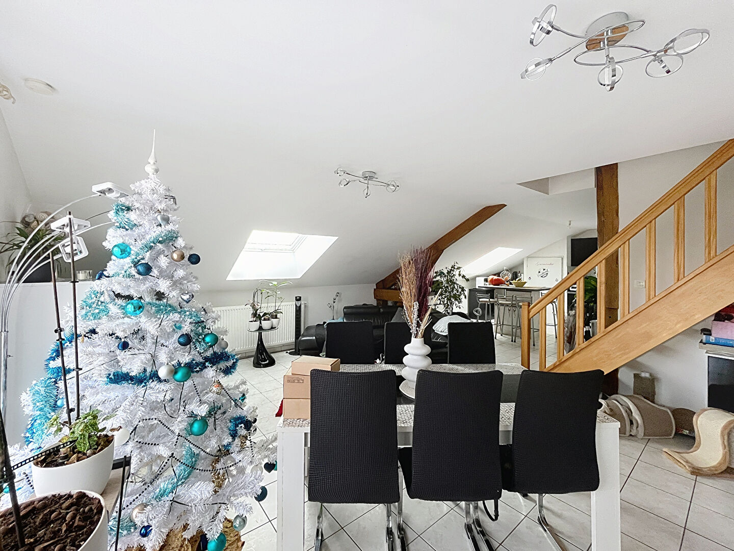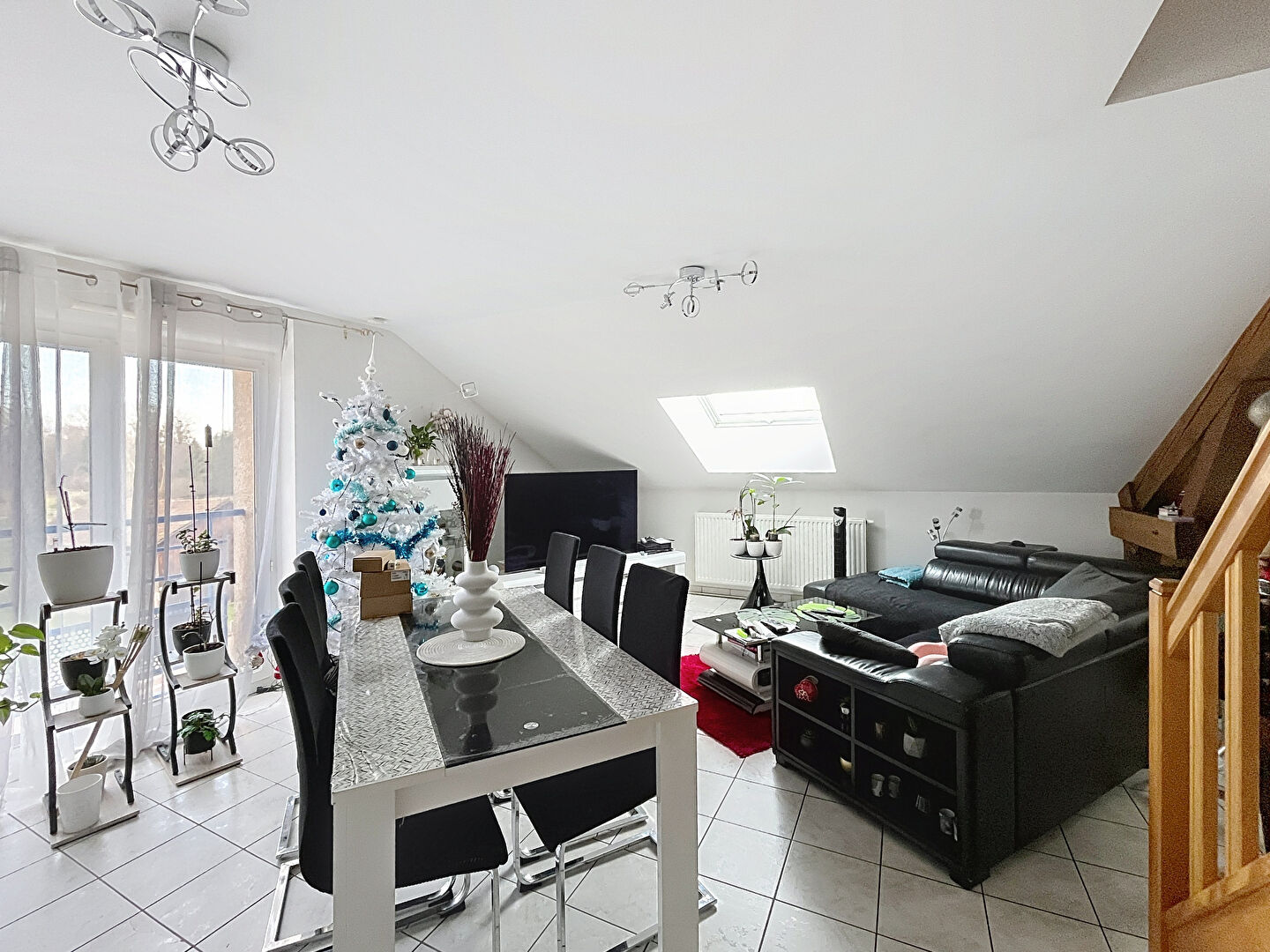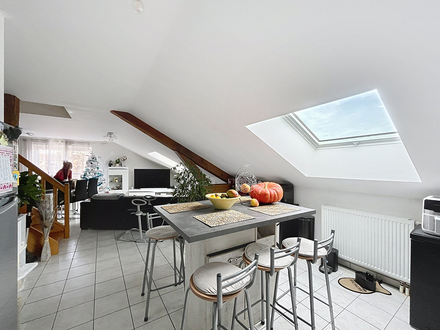 Appartement F4 au dernier étage comprenant : une entrée, une cuisine ouverte sur séjour, une salle de bain, WC séparés et 3 chambres à l'étage.