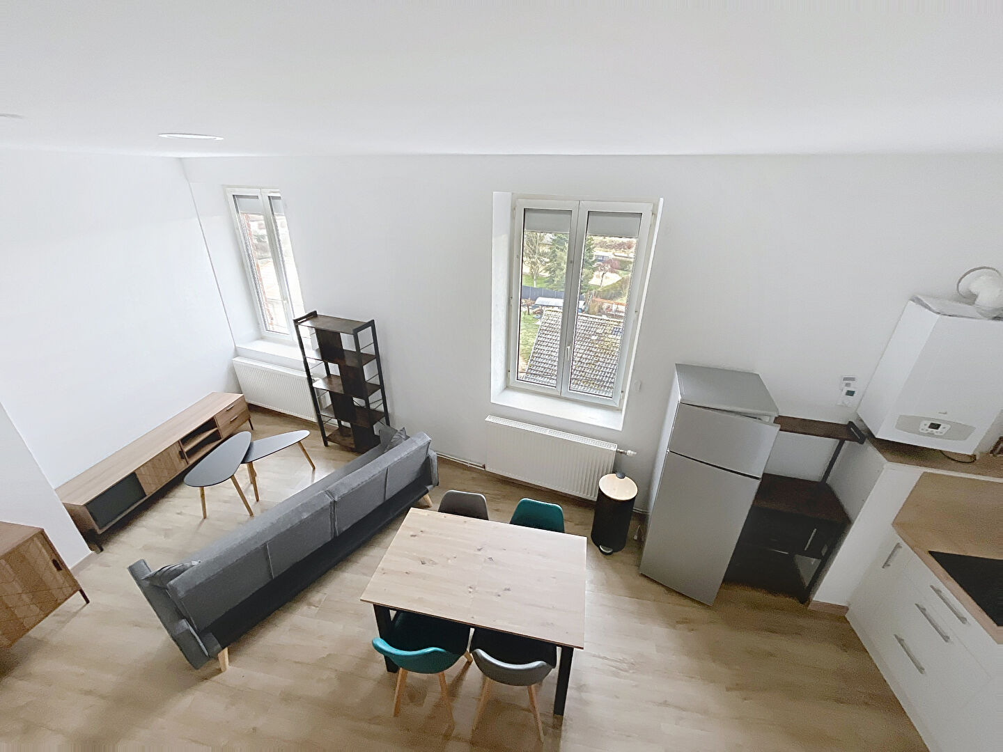 - au 1er niveau : une cuisine équipée ouverte sur séjour, une salle d'eau, un WC