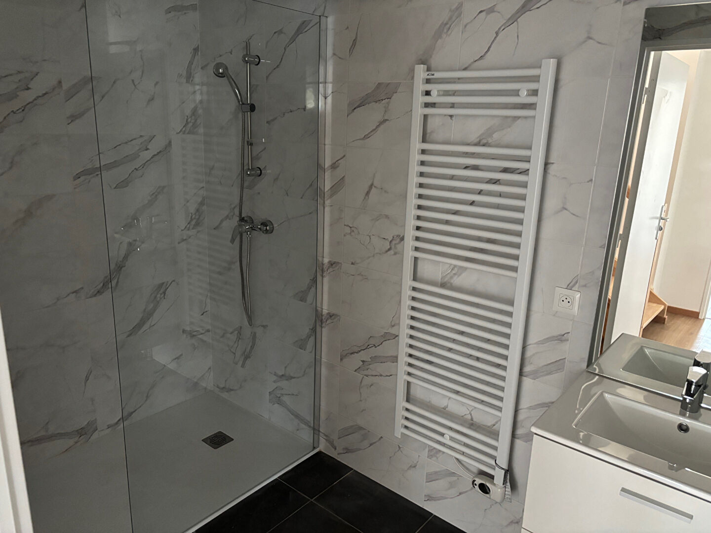 1er niveau : une entrée avec placards, un séjour ouvert sur cuisine aménagée et équipée (four, plaques, hotte et rangements), une chambre, une salle de douche et wc, un balcon.