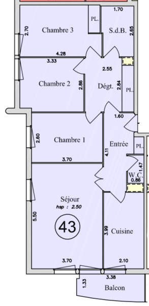 Cet appartement comprend une entrée avec placard desservant un séjour et une cuisine séparée donnant tout deux sur un balcon et un dégagement avec placard desservant trois chambres, une salle de bains et WC séparés.