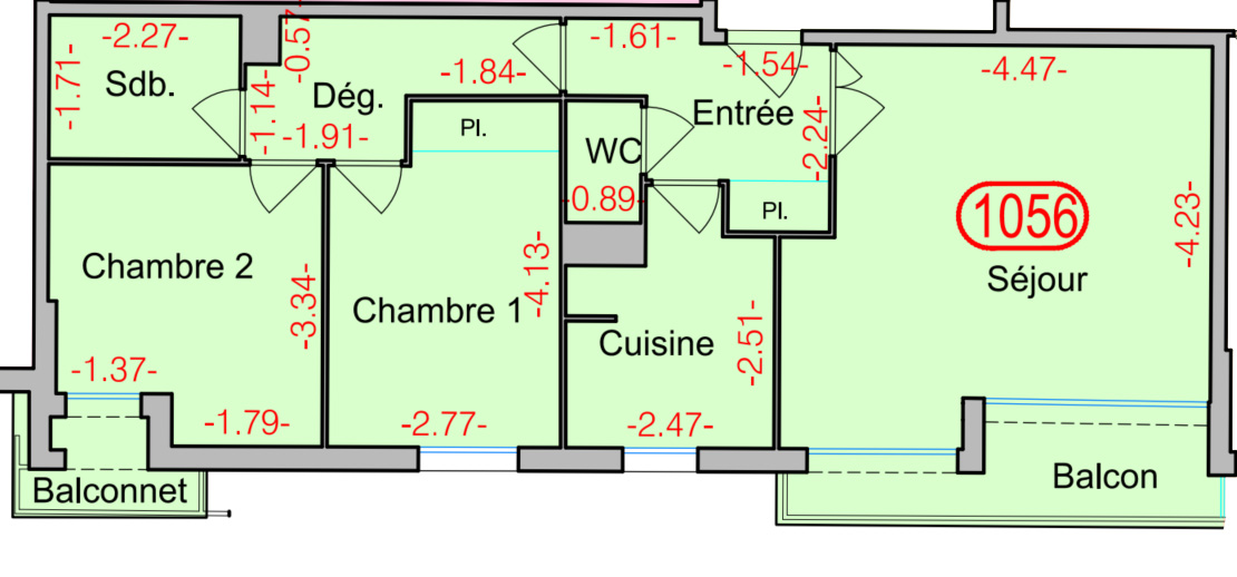 Ce bien se compose d'une entrée, d'un séjour donnant sur un balcon, d'une cuisine séparée, d'un WC indépendant et d'un dégagement desservant les deux chambres dont une avec balcon et la salle de bains.
