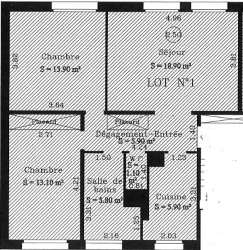Il se compose d'une entrée avec placard, d'un séjour de 18,94 m², d'une cuisine indépendante, de deux chambres de 13,90 m² et 12,89 m² (dont une avec placard), d'une salle de douche (possibilité de mettre une baignoire) et d'un WC indépendant.