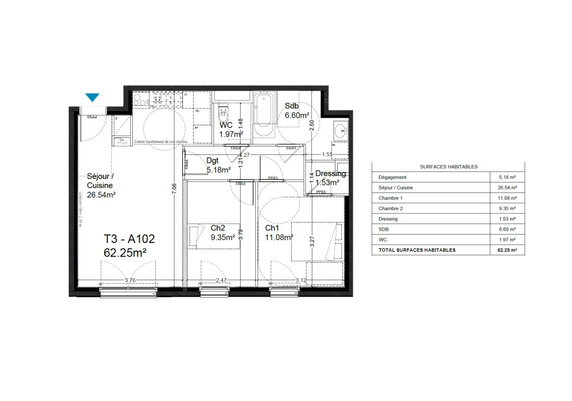 *LOGEMENTS : Appartement 3 pièces de 62.25m² offrant une entrée, un séjour de 26.54m² avec cuisine ouverte, 2 chambres de 9.35m² et 11.08m² avec placard de rangement, un cellier, une salle de bains et un WC indépendant. Une place de parking complètent ce bien.