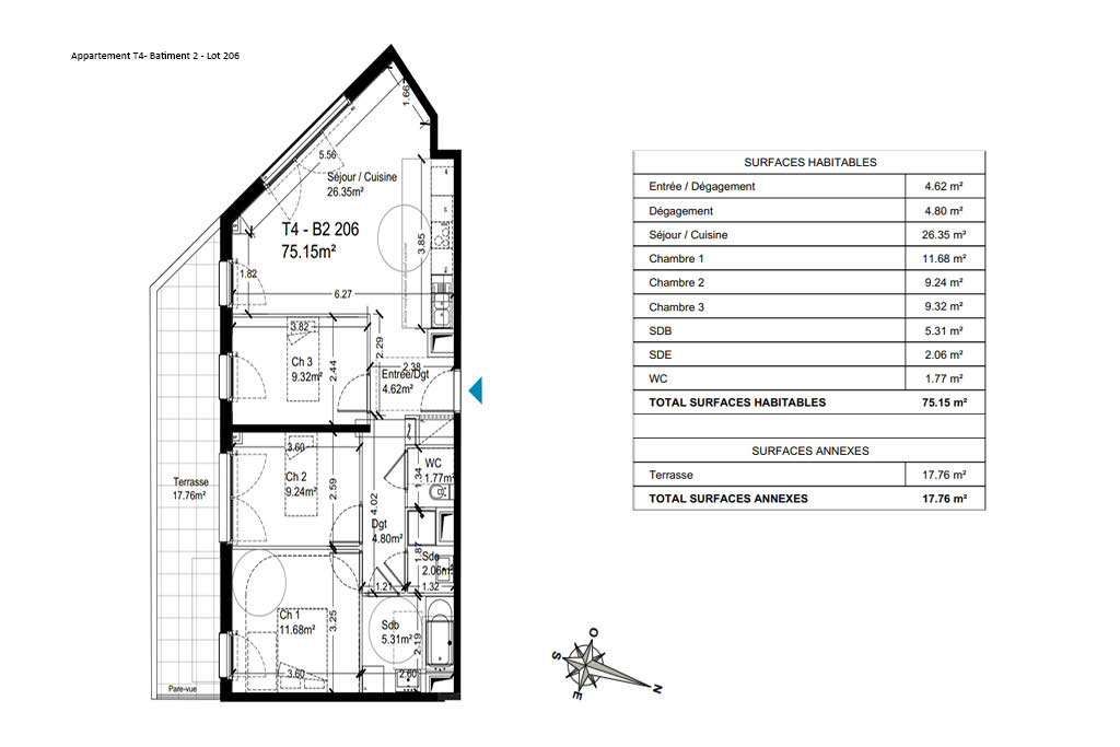 *LOGEMENTS : Appartement 4 pièces de 75.15m² offrant un grand séjour de 26.35m² avec cuisine ouverte, 3 chambres de 9.32m² à 11.68m², une salle d'eau, une salle de bains, un WC indépendant ainsi qu'une terrasse de 17.76m². Une place de parking complète ce bien.