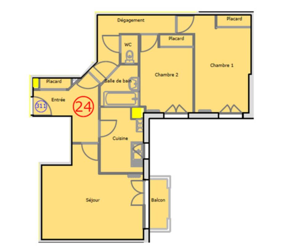 Il se compose d'une entrée avec placard, d'un séjour avec balcon, d'une cuisine fermée, de deux chambres dont une avec un placard, d'une salle de bains et d'un WC séparé. Une place de parking en sous-sol sécurisé. Chauffage collectif ainsi que l'eau chaude et froide.