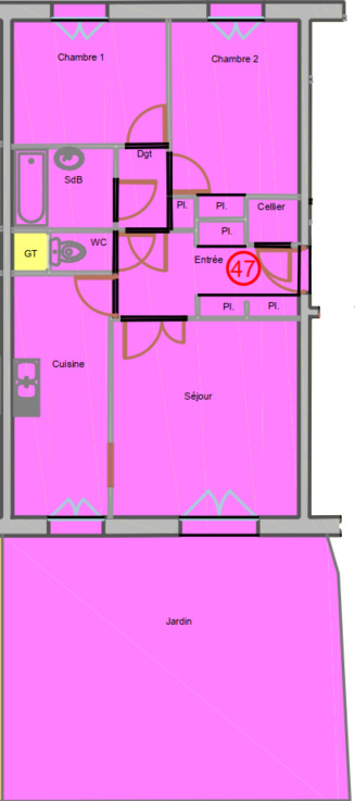 Il se compose, d'une entrée avec des grands placards, d'un séjour exposé Sud-Ouest, d'une grande cuisine avec possibilité de l'ouvrir sur le salon, de deux chambres, d'une salle de bains et d'un WC séparé.