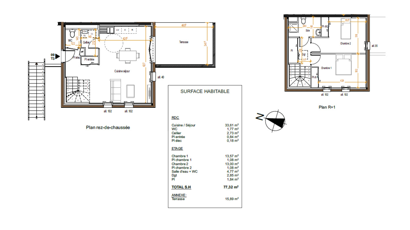 LOGEMENT : bel appartement de type T3 duplex comprenant une grande pièce à vivre de 33 m² avec cuisine ouverte et accès terrasse de 15 m², 2 chambre avec placards intégrés, une salle de bain et une place stationnement.